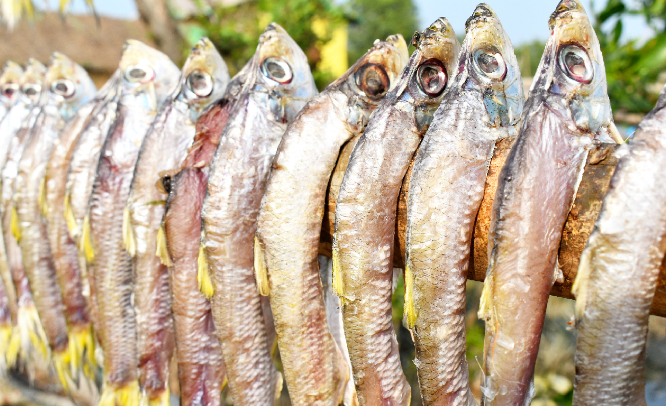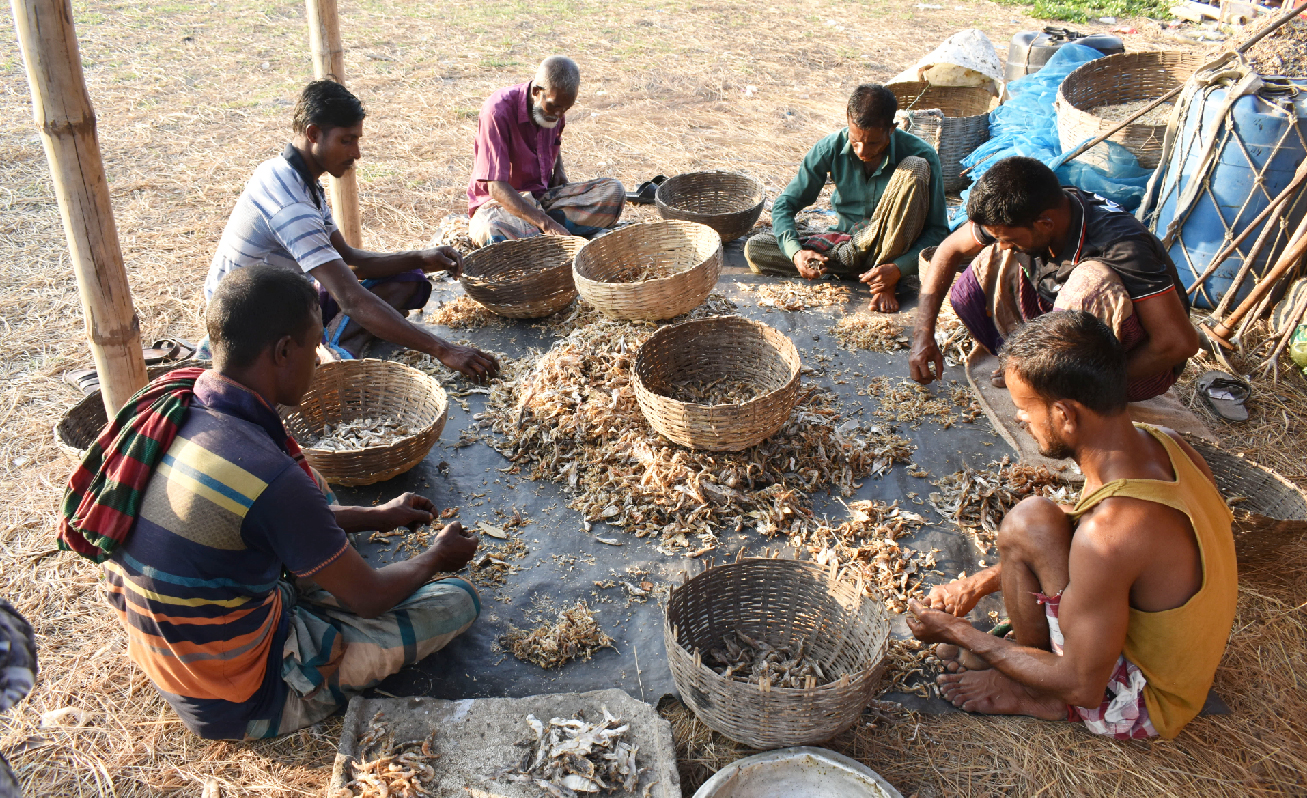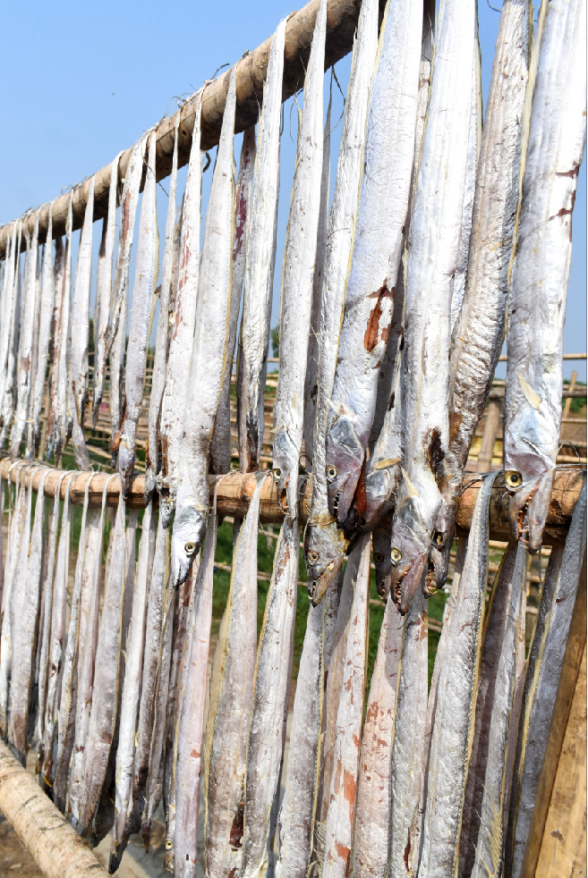Life on Dubla Island follows a rhythm shaped by the sea. The fishermen stay in makeshift camps locally known as “Chhals”—simple structures made from bamboo, tarpaulin sheets, and mangrove wood. Each camp is led by a “Majhi,” who organizes fishing teams and manages daily activities. The fishermen head out to the open sea in groups, often spending several days on their small boats. Their days begin before dawn as they venture into the waves to cast nets, catching fish, shrimp, and other marine life that sustain the local fishing economy. Once the boats return, the catch is processed immediately—cleaned, sorted, and dried under the sun to produce the famous Dubla Island dried fish (Shutki). The entire island becomes a giant open-air drying yard during the peak season, with rows of fish spread across bamboo racks, filling the air with a distinctive scent. This dried fish is later sold across the country and also exported abroad, supporting thousands of livelihoods.